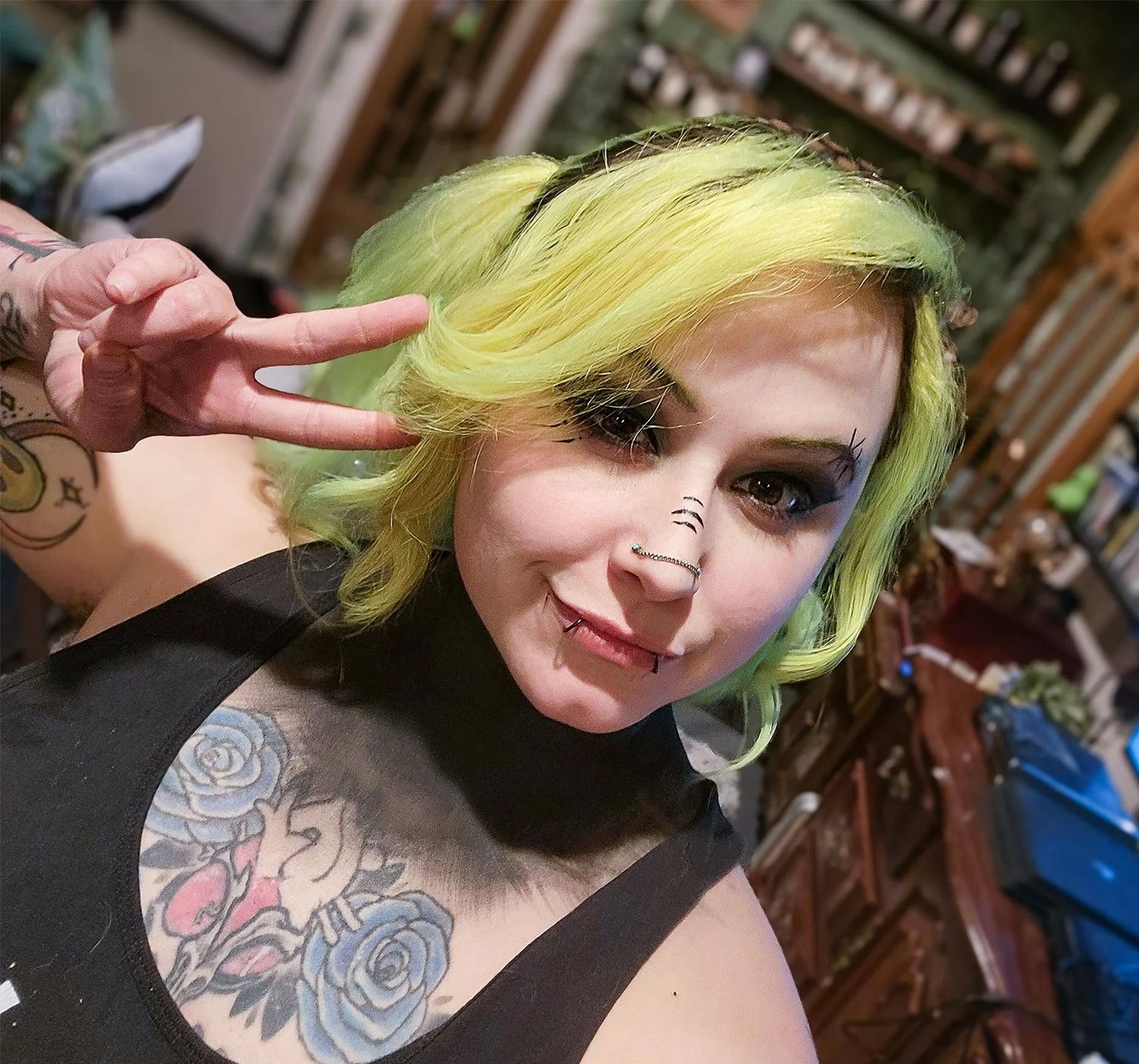 Hey, I'm Xavier, but you can call me Xae. Born and raised right here in Fort Collins, I've always dreamed of becoming a body modification artist. Growing up surrounded by people with tattoos and piercings inspired me to pursue a career in decorating people. My favorite piercings to do are bridge, navel, and large gauge, but I enjoy any piercing! I prioritize safe piercing practices and strive to create a comfortable environment for everyone. Whether you're looking for decoration or self-liberation, I'd love to meet you and add some sparkle to your life! In my free time, you can find me tending to my plants, hanging out with my kitty and spiders, attending oddities conventions, or rocking out at goth or metal shows.
